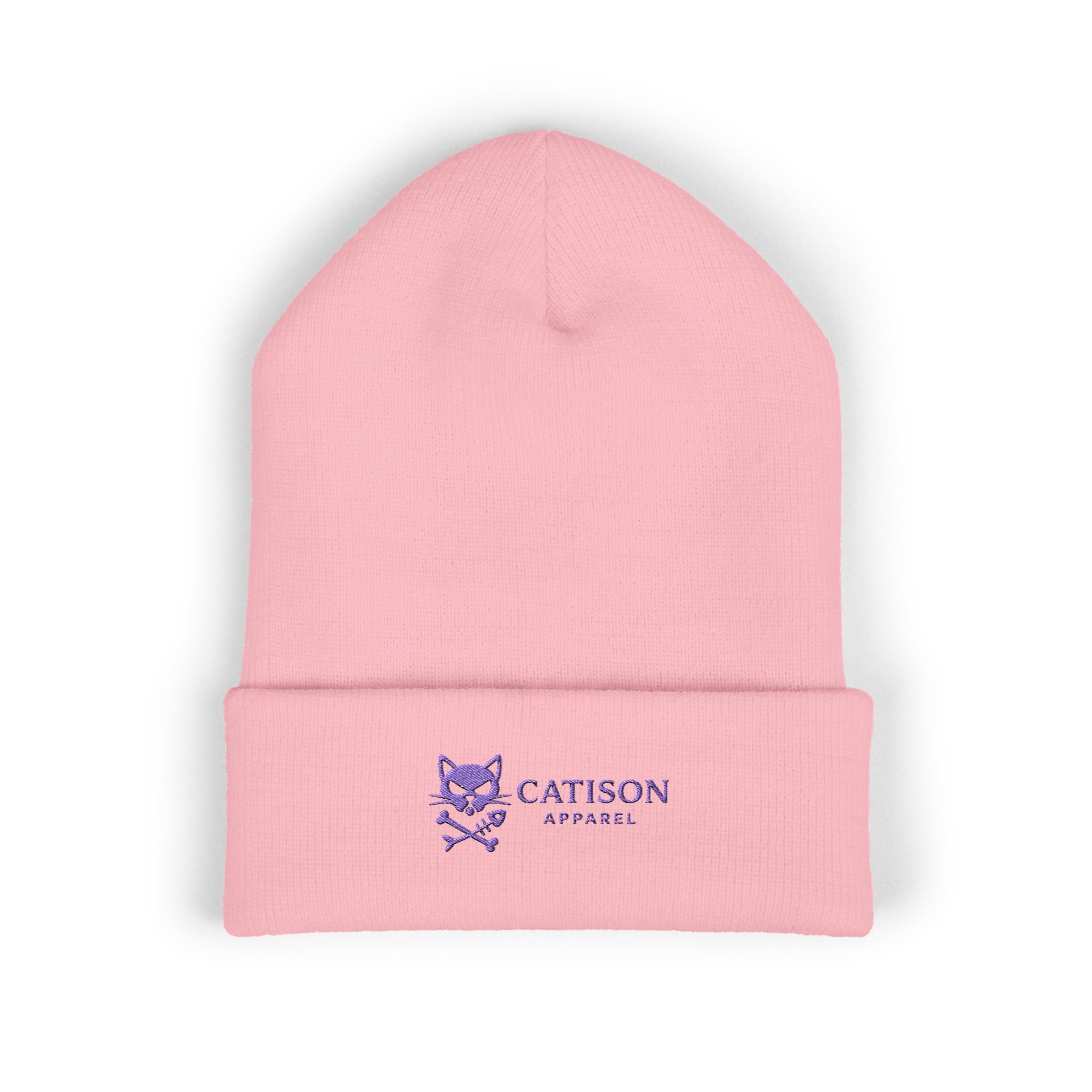 Embroidered Catison Signature Beanie — Pink with purple embroidery.